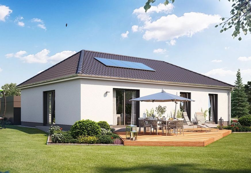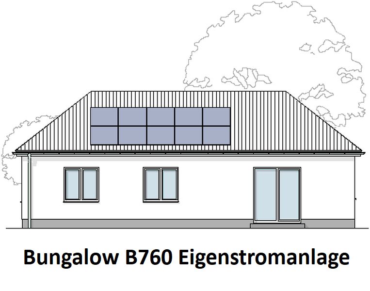 Der abgebildete und beschriebene Bungalows B 760 mit großer Eigenstromanlage wird durch Heinz von Heiden Massivhäuser auf Ihrem Grundstück errichtet.