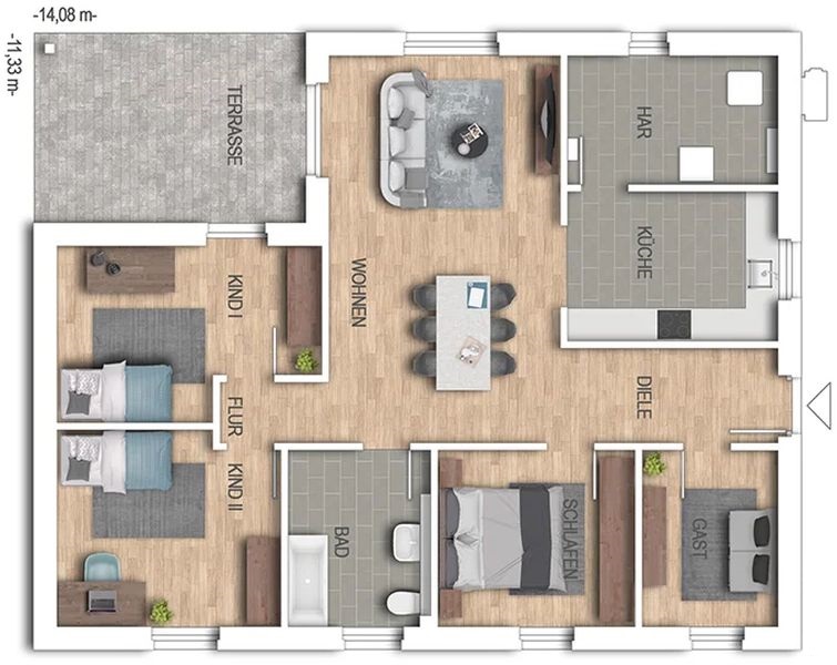 Außenmaße = 14,08 m x 11,33 m.