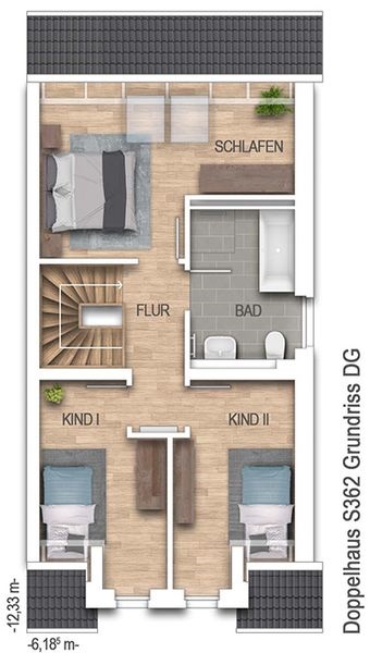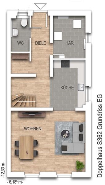 Außenmaße Haushälfte = 12,33 m x 6,19 m.