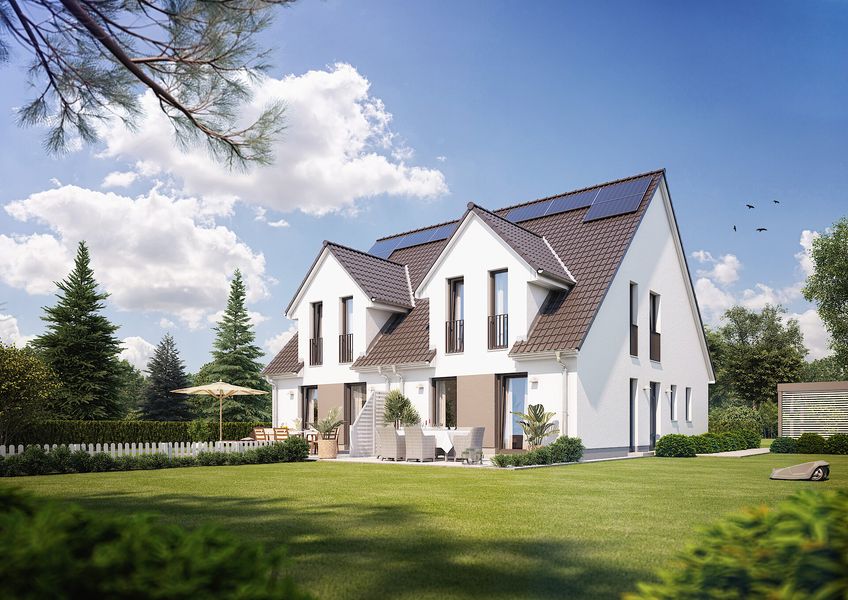 Heinz von Heiden Massivhäuser errichtet auf Ihrem und dem Grundstück der anderen Bauherren beide Doppelhaushälften mit großer Eigenstromanlage.