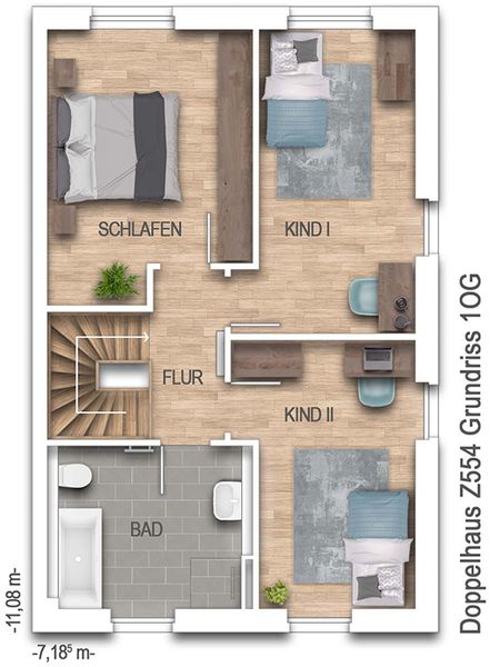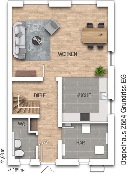 Außenmaße Haushälfte = 11,08 m x 7,18 m.