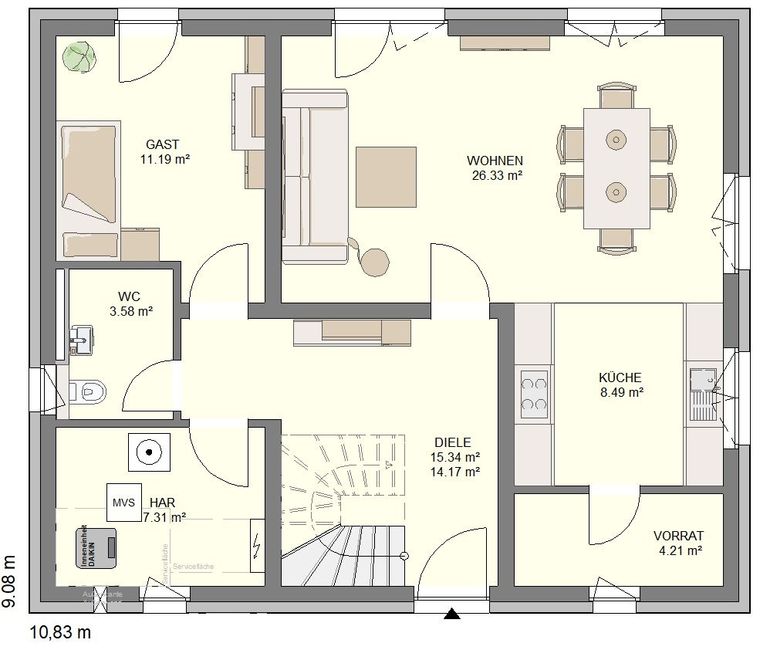 147 qm DIN-Wohnfläche. 6 Zimmer, Küche, Bad, Gäste-WC, Diele, Flur, Technik- u. Abstellraum.