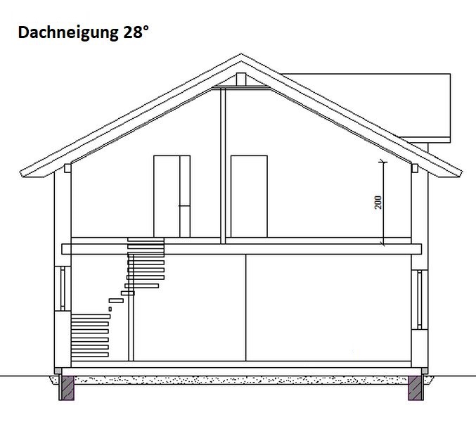 28° Satteldachkonstruktion aus Qualitätsholz und mit Braas-Dachsteinen eingedeckt.