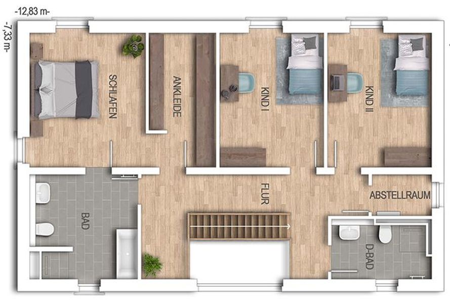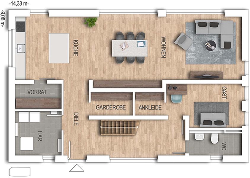 200 qm DIN-Wohnfläche. 4 Zimmer, Gastzimmer + Ankleideraum, Küche, Bad, Duschbad, Gäste-WC, 2 Abstellräume, Diele, Flur, Technikraum.