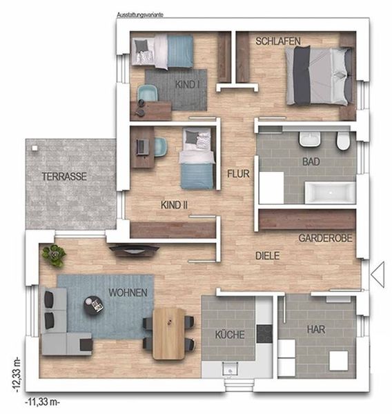 103 qm DIN-Wohnfläche. 4 Zimmer, offene Küche, Bad, Diele, Flur, Technik- u. Abstellraum, 9 m² überdachte Terrasse.