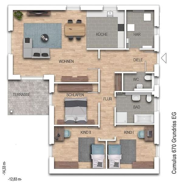 Der Winkelbungalow bietet Ihnen 127 m² Wohnfläche + 11 m² überdachte Terrasse.