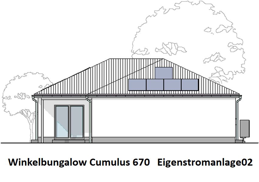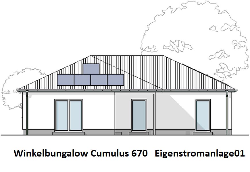 Der abgebildete und beschriebene Winkelbungalows Cumulus 670 mit großer Eigenstromanlage wird durch Heinz von Heiden Massivhäuser auf Ihrem Grundstück errichtet.