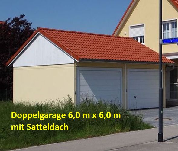 Lieferung und Aufbau einer Doppelgarage 6 m x 6 m mit Satteldach, Regenrinnen, elektrischen Torantrieben, Erdarbeiten, bewehrten Streifenfundamenten.