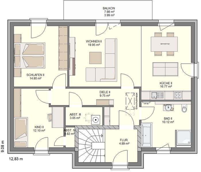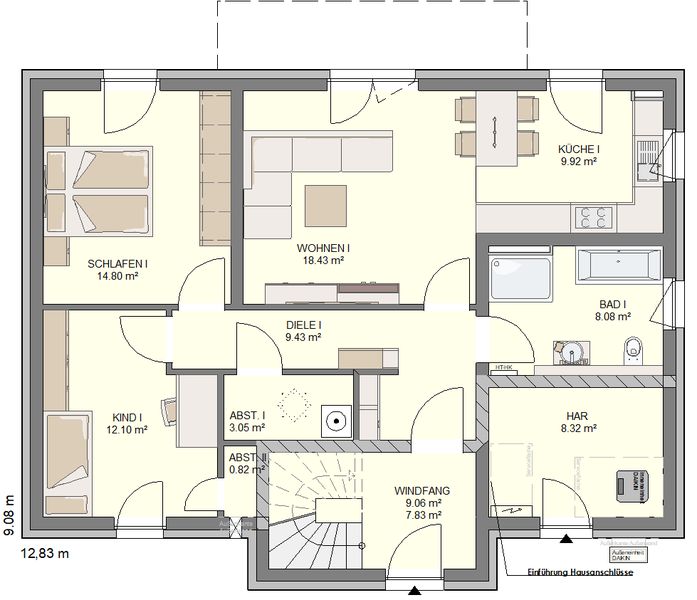 Außenmaße: 12,83 m x 9,08 m + 1,00 m Eingangsgiebel