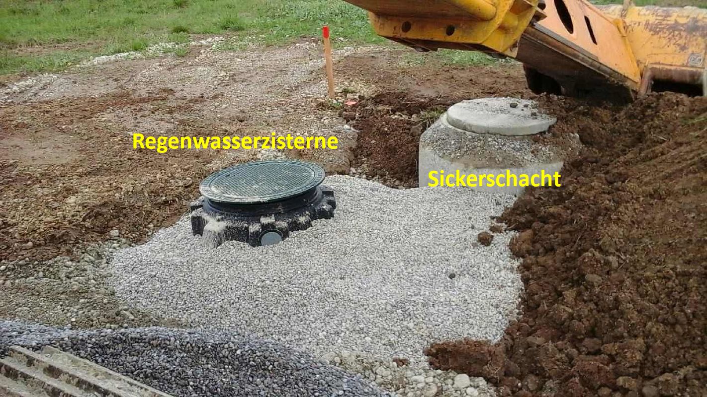 Lieferung einer 3.000 l Zisterne mit integrierter Tauchpumpe und eines Sickerschachtes. Einbau der Zisterne und Anschluss der Regenfallrohre sowie Einbau eines Sickerschachtes für das Überlaufwasser der Zisterne.