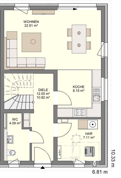 WU-Bodenplatte auf gedämmten Fundamenten gelagert. Erd- und Ober- und Dachgeschoss aus 42,5 cm Poroton-Außenwänden, gedämmt + Edelaußenputz + glatter Innenputz. Poroton-Ziegelinnenwände, beidseitig glatt verputzt. Toller Schallschutz von Raum zu Raum.